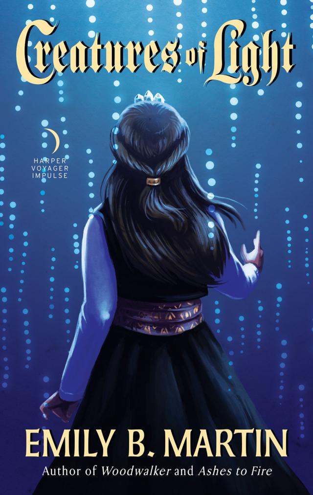 He skidded to a halt on the icy rock, his heart rate spiking. She was standing so still at the edge of the trees that his gaze had passed over her as part of the landscape. But there she was, her feet spread on the snow, the moonlight glinting off the silver pin on her lapel. Despite her cloak covering the rest of her uniform, that pin and the double band of fringe on her boots communicated her office—a Woodwalker, a steward and protector of the Silverwood Mountains, charged with keeping interlopers like him from harming the forest and its residents. Another glimmer of silver across her brow betrayed her other title, one she took to with significantly less fervor: Queen of the Silverwood.