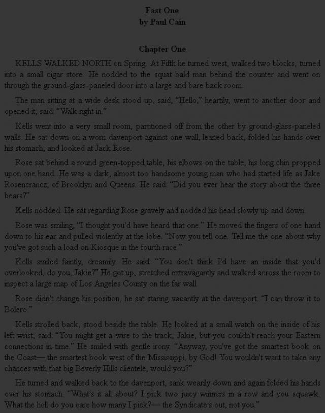 He dialed a number printed in large letters on the cover of the telephone book, asked for the Reporters' Room. When the connection was made, he asked for Shep Beery, spoke evenly into the instrument: “Listen, Shep, this is Gerry. In a little while you'll probably have some news for me.... Yeah.... Call Granite six five one six.... And Shep— who copped in the fourth race at Juana?... Thanks, Shep. Got the number?... OK.”