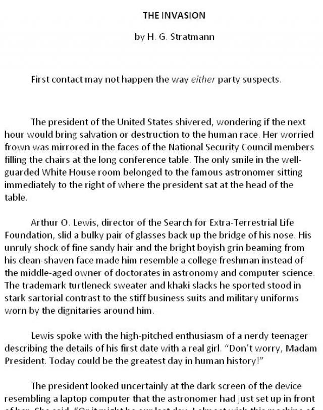 The president stared at her general, worried about his taste in movies and recreational reading material—and unsure whether he was really serious. After deciding she’d rather not know if he was, she replied, “While that possibility seems a bit ... remote, I must consider every ramification of making what Dr. Lewis calls ‘first contact.’ Earlier in this meeting you all heard him describe the many potential advantages of beginning a dialogue with these aliens.