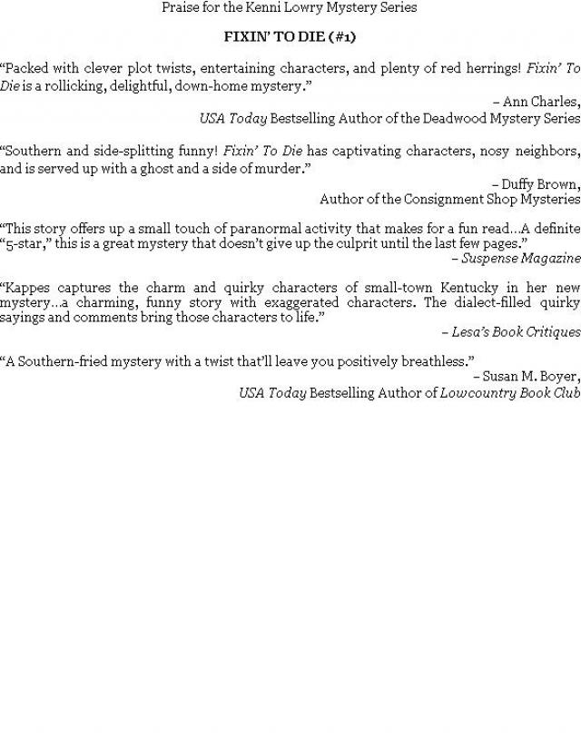 “Packed with clever plot twists, entertaining characters, and plenty of red herrings! Fixin’ To Die is a rollicking, delightful, down-home mystery.”